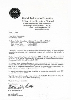 This is to announce that following the decertification of the Malaysia Global Taekwon-Do Federation (MGTF) as the governing body on September 25, 2005 by the GTF HQ and its subsequent withdrawal of recognition as the Independent GTF Body in Malaysia on November 28, 2006, MGTF shall cease to be an affiliate member of the GTF. Henceforth MGTF is no longer authorized to represent GTF interest in Malaysia and therefore not authorized to use GTF’s logo and all other proprietary rights associated with GTF.